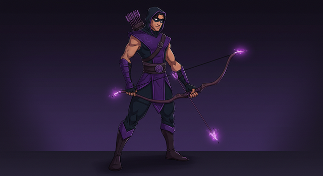 Hawkeye. I honestly know little to nothing about this character.By the way, that is stylised feather patterns on the purple parts of clothing.