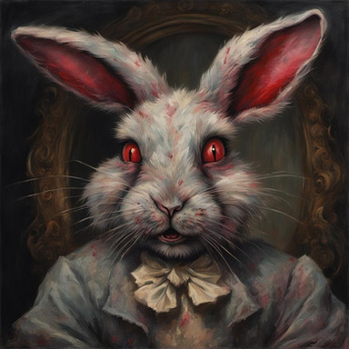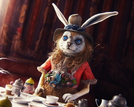 #alice #aliceinwonderland #darkfantasy #digitalart #fantasyart #rabbit #surrealart #tea #teaparty #whiterabbit #generativeart #midjourney #midjourneyart #mangorai