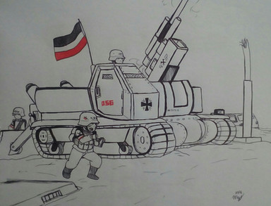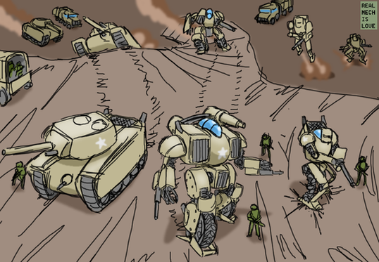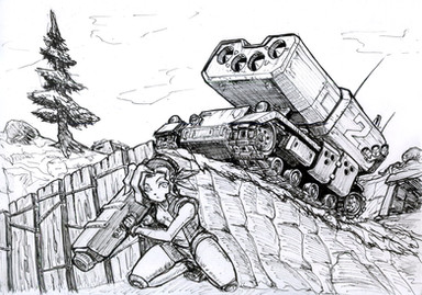 This is a drawing based off one of my favorite games in the universe, the Metal Slug Series. Its a futuristic, but hilarious, war side scroller with many characters, weapons, power ups, and vehicles. The tank at the top is the SV-001 Metal Slug, my favorite tank in the universe. It can jump, duck, has two 360 degree rotating vulcan cannons, and is down right badass. The truck at the right is a transport truck you can ride in during one of the games. Near the bottom is one of the pride and joy "Slug" transports. The Ostrich Slug! She has two vulcan cannons, can run fast, jump high, offers no passenger protection, and is down right cute.The two soldiers are just that, part of the convoy, making sure the road is safe. The girl is based off Eri, one of the playable characters.