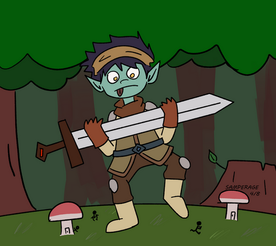 One day I'll be level 20, then you'll be sorry!Last drawing of my fairy adventurer. At level 18, Rune Knights can grow to huge size while in combat. So here's her showing some level 1 goblins what for!