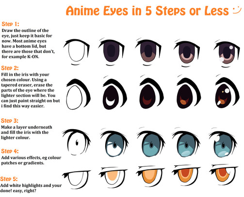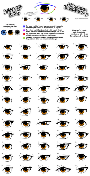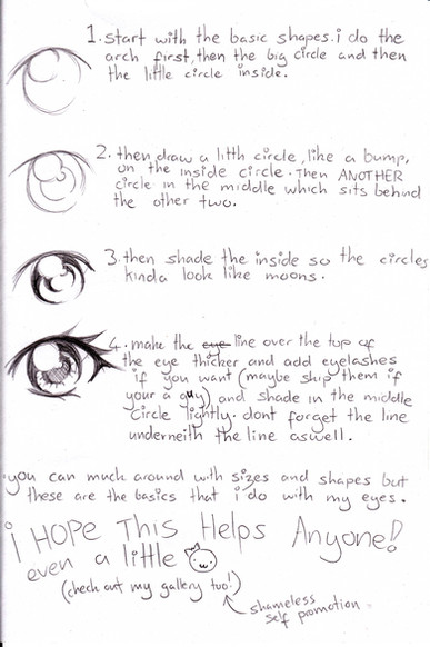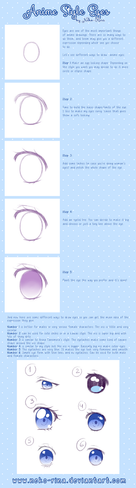 Alright now, the picture will help, but it is not complete. The rest of the instruction are in the artists comments. If you have any questions after reading this, feel free to ask.Before I begin however. I must say this. I am only giving a little bit of information about doing anime eyes. There are countless ways to draw eyes, there are countless eye shapes, personalities, and of course expressions, and I am not talking about any of these. I am only giving some basic guidelines that I hope will help you to find your own style. The eye on the bottom, which gets colored is completely different from the eyes in the rest fo the tutorial. It is Kojisai's eye, which is totally different from the eyes of any of my other characters. What I am saying is that while you will want to copy the technique, don't try to copy the lines I use exactly... I think you will get more out of this tutorial that way.