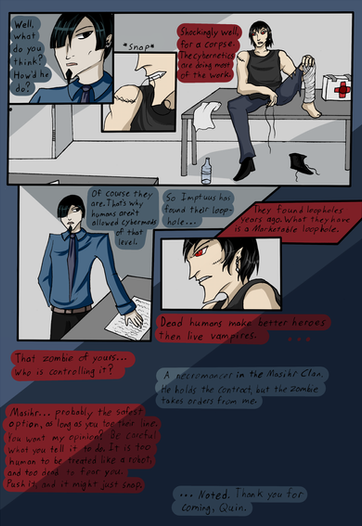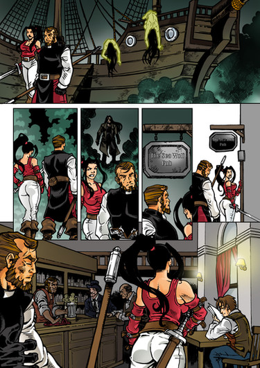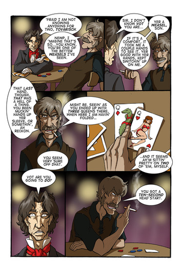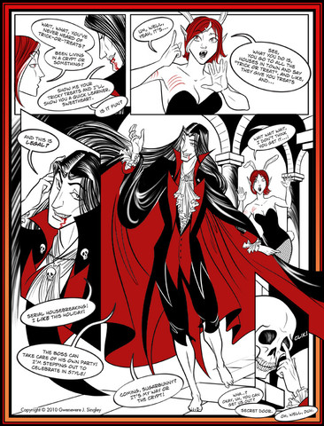 Crow: You can tell I wrote this because Niko is not wearing a shirt, and it's only the first page, and I've already made Miss Pixie draw a buttshot. Tee-hee! Also, I love that Hunter leaves his feather boa on the hat rack.