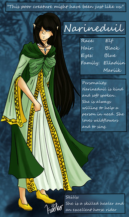 Hehe, I like the descriptions. This may sound weird, but for some reason her design makes me think of what it would look like if you took Snow White and the Witch from that old Disney movie and mashed them together.