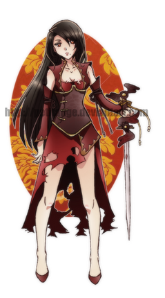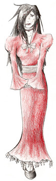 the flowers on her gown are thistles - spiky flowers with a mullet, but flowers nonetheless. she has a split (the better for fighting in) and i was unable to separate her from her boots. The sigil on her locket, and on the walls, is the Gokiburi-Gumi clan symbol. The figures on the wall hangings are *Endling 's Ree, Lilith and Rex - her 'bosses', and i'd like to hope they're cheering on a fellow GGer.