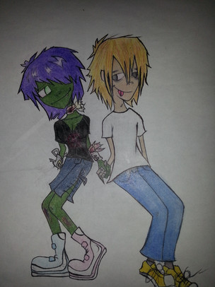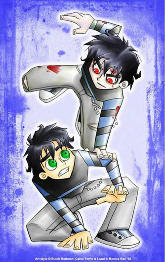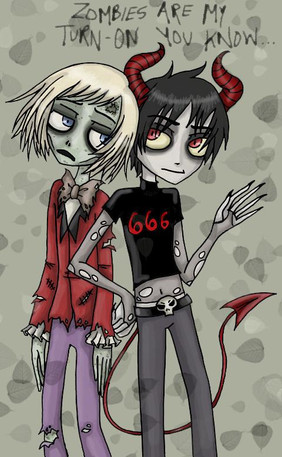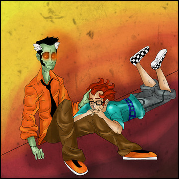 flipsidered is an artist on DA, the creator along with Miyu of the Maggot Boy comic about a pair of sentient zombies. some of her stuff is in my favourites. The comic is on 21 pages thus far, and a really good read. Chainey and Davey, the zombies, are the main characters thus far, along with Lazaro the tyrannical anti-hero. i love drawing them mainly because of the character design and behaviour - chainey and davey's personality always shows through in their body language.
