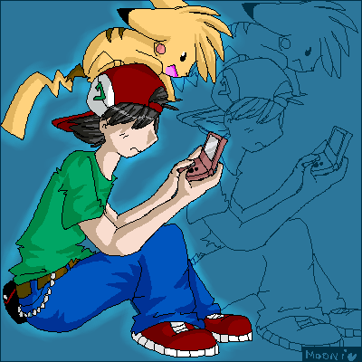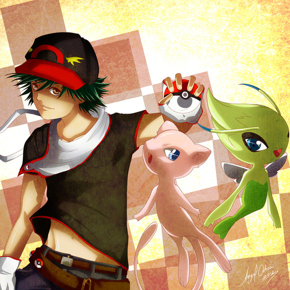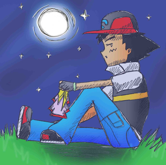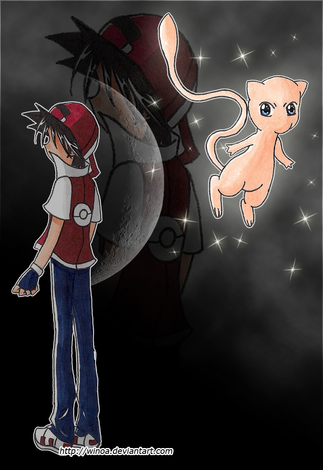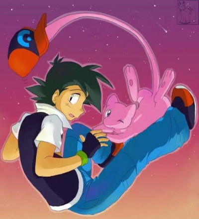 Ash and Mew at National Park. :3Mew is trying to cheer Ash up with a berry!