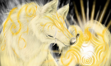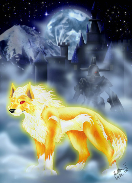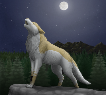 Awesome! Tis teh golden wolf warrior d00d! XD I like howling on there X3333333 The colouring's awesome and I love your smudgy moon and background XD Makes it look incredibly cloudy X3