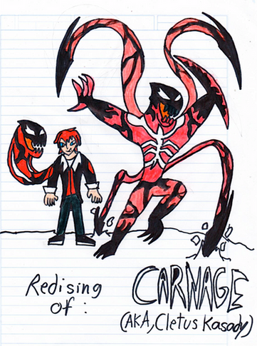 Of course Spiderman ([link] ) couldn't turn down the help request of Eddie and for a moment he bonds with a little piece of Venom that was left behind giving him the Black Suit . Once Venom returns to Brock. the symbiote took again full control of hes host and in hes rage, he combines with Carnage to produce this creature.