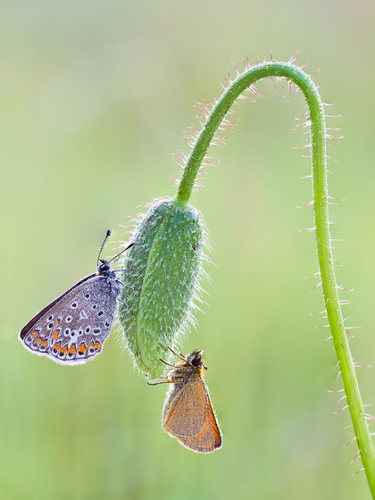 really cool shot! I get shivers down my spine when I see this. Because the sun is setting and the mantis is black, I feel that the mantis is a creature of the night. Waiting patiently for its next victim in shadow. And just when the other insect gets notice of our mantis its too late.