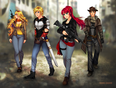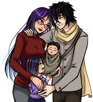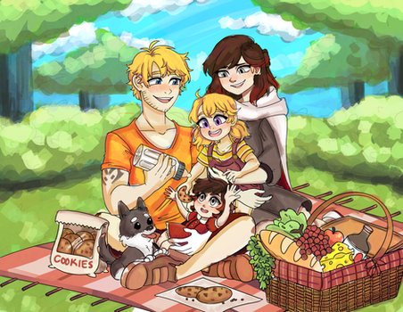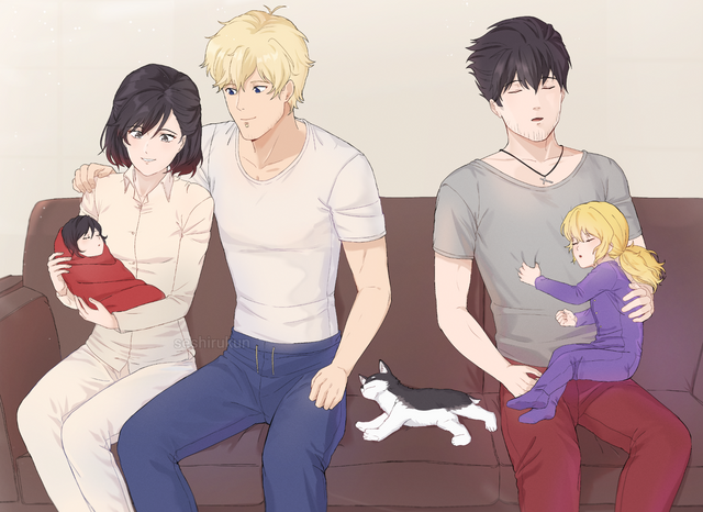 Featuring his RWBY original character Blackburn along with Winter Schnee and their children and dog.