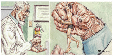 Watercolour with a few Photoshop touch-ups.After he put down the little man on the examination platform, the scientist leaned over and looked at his tiny victim straight in the eyes: "You stay on this platform until I come back for you," he said sternly.