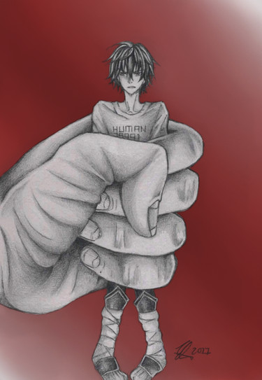 Digital. The giant is picking up the little man out of the shrinking chamber. It feels good to be able to hold him in one fist.Related content