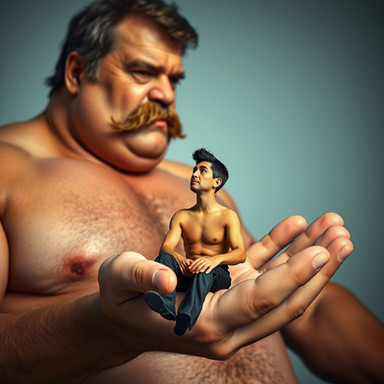 Mixed media: traditional and Photoshop.The little man felt great sitting in that huge genuine leather hot chair that was the giant scientist's hand; he had no fear at all, he was in total awe of that genius who had managed to shrink him down to such a small size. The imposing man was sometimes a bit rough handling him with his big paws but it was alright, the little one knew he was in no danger, on the contrary, he represented the completion of decades of hard work. The tiny guinea pig could deeply feel how precious he was.