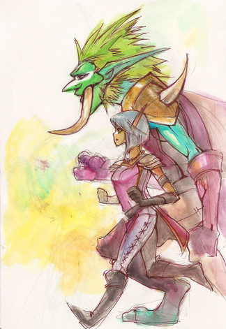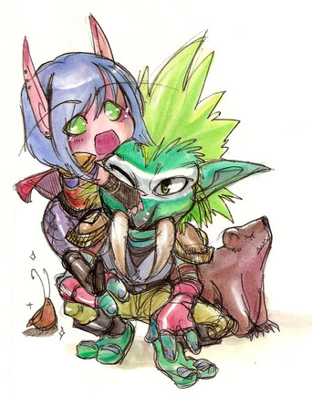 There she goes being curious again, and Alli giving her a chance to be... the poor guy.This is probably them around the lvl 50s or so with made up armor crap cause everyone knows wow armor is a challenge to draw xD