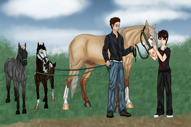 David appeared to have chosen Phuckyes as his ride, the light coloured stallion stood at the end calmly as he was groomed. Probably a good choice. Mike, on the other hand, had chosen one of his own horses. The imposing figure of Imminent Collision stood beside Shakil, proud and gleaming in the sunlight. Maybe not a great choice for gymkhana, but he was an impressive horse. His bright blue markings were shimmering and Mark had to admit he felt a little envious. All of Mike’s horses were gorgeous, and now he had the pleasure of working with all of Somesmera’s Peafowl Friesians too.