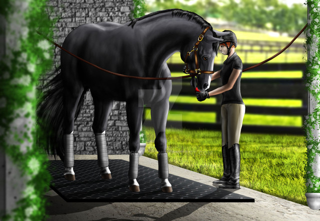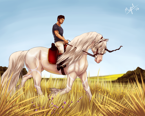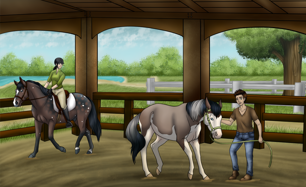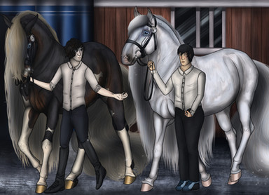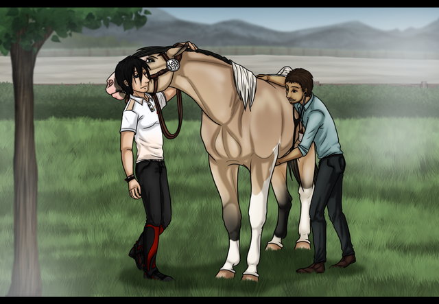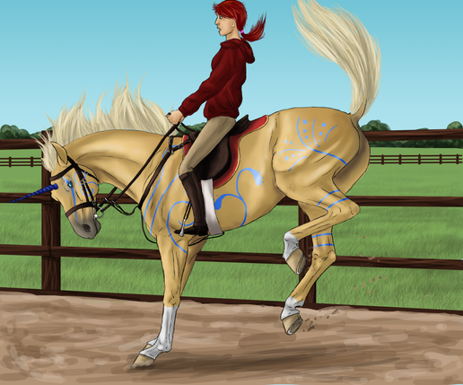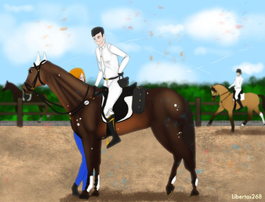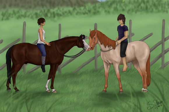 Overall I really like this artwork! I especially like Fru's head, very nicely done, and I love the attention to detail you've put into the tack. Lee looks great too, the position looks natural and fits the picture perfectly. I only have two small critiques, I hope you don't mind. To me, Fru's hind end looks a little tall, specifically her hind cannon bones. They could be a tad shorter. Also, Lee could use a little bit longer neck, however I haven't seen his refrence so I'm not sure if that's just how the refrence looks. Despite those two tiny things, you've done a wonderful job!