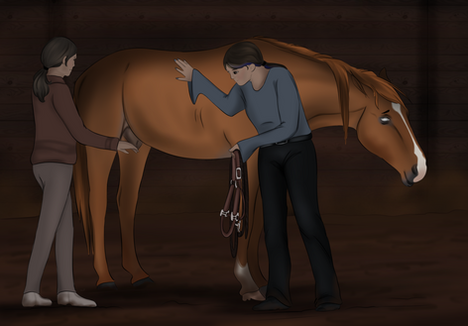 "I've been trying to walk her, but she just kinda waddles," she chuckled. Lee grinned and nodded, picking up each hoof individually to check for any problems and then checking her neck and listening to her breathing.