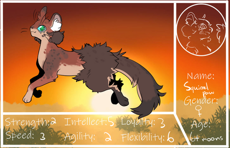 Opportunistic - If a situation that Squirrelpounce thinks could benifit her comes up, she pounces on it without hesitation(hehe see what I did there?) and takes it for all she can. It being something like chasing prey deep into another clan's territory or other things of the like.