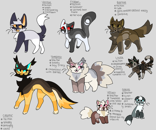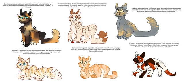 For those unaware and interested! In the group Days--End all the cats have been exposed to radiation for many many years and each clan can start with 3 different mutations, two on each character so in the discord group i had everyone randomly pick two numbers out of 4 and 4 made it only one mut leaving us finally with this group of misfits!