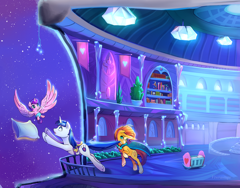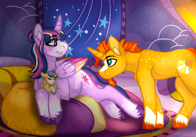 I love to imagene since Sunburst and Twilight got married, Shining and Flurry visit really often, as often as they can really because Sunburst is very dear to them, Flurry thinks of him as a second father though he's technically her uncle now. And she absolutely ADORES Evening. So when the little nerd horses fall asleep reading together, Flurry takes it upon herself to cover them up and make sure they are snug. Her Aunt and daddy have no idea of the cure little scene just behind them.First time drawing Shining Armor and Flurry heart. Love them both lol may draw them more often. I forgot how nice it can be just to draw ponies sometimes lol