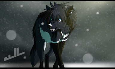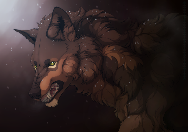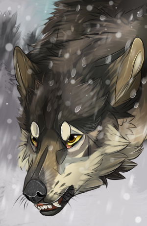 Woah, this is wicked! I really love that pose and especially that brave, angry snarl of his- he definitely looks fearless to me. Once again, I really adore all of the fur detail in this, and I think the two little feathers are a nice touch to the piece. I think it's really effective that it's in such a harsh environment as well; the snowstorm and the cold really make him look even more fearless, as if not only his opponent doesn't bother him, but neither does his harsh surroundings. I think the light coming in from the back looks kind of like a glimmer of hope as well, like he can take on what he may have previously feared. Excellent work once again.