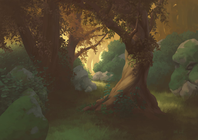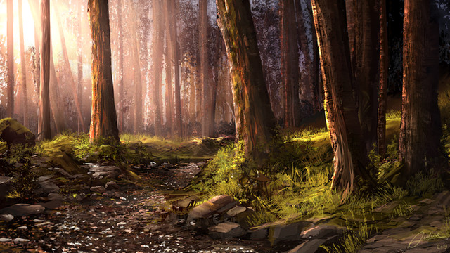 I wish I had gorgeous forests like that near me but, alas, I live too far into the city ;v; Beautiful piece though! I adore the lighting looks so peaceful~