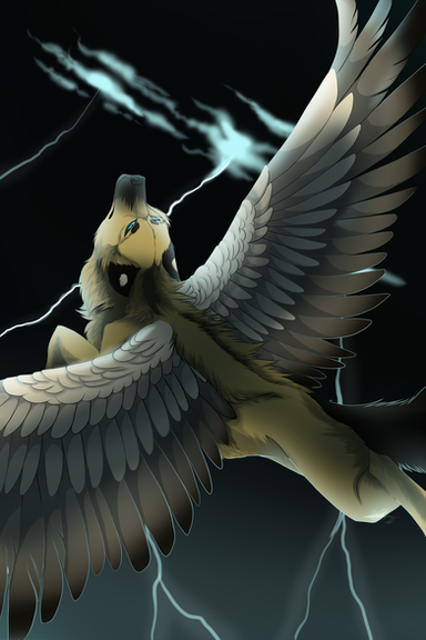The character is really gorgeus, and your way of colouring and shading just beats me - I'm here staring at the work all amazed, it provides so much to chew on and something for my eyes to wander on. Intricate details in the wings as well, and I love when blue is used as a colour to comfort brown, they work so well together in my opinions. My only problem in otherwise such a strong piece is the quite neutral profile pose - I think the subject of the image would've allowed to a lot more adventorous take on it! Also the background being the same brown hues as the canine seems to suck up the character instead of uplifting it and really bouncing it out from the image. Other than that, the character design is to die for! @,@ Well done!