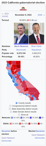 California is a semi-presidential republic, with the President acting as the Head of State and the First Secretary acting as Head of Government. With few exceptions, the President is required to be politically neutral and his powers are mostly symbolic. California elects its government using a parallel voting system: the Chamber of Representatives is composed of single-member districts elected in a two-round "jungle primary" system similar to what California uses IOTL. The Senate is elected via proportional representation based on the overall popular vote in the second round/general election, with seats distributed geographically based on vote share. (For example: Most of the Progressive's Senators are from the San Francisco and Los Angeles Regions, since the majority of their votes came from there.)