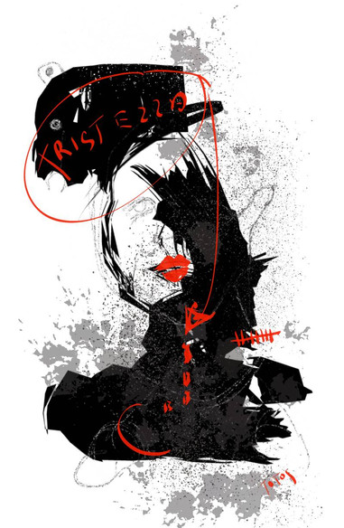 wow. Her face is so grim but strong. The red is blood and the broken glass everywhere looks painful. This is very good in composition. I keep going back to her face: her mouth is turned down, and her eyes look away, it's very good