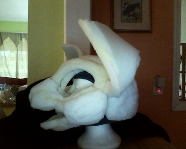 ive finished all the foaming for the head, including the eyebrows and taking the foam around the temples out. ive also managed to finish the eyes and theyre glued in place now.all the fur in this picture is crocheted from 1 piece and pinned in place. i havent done any sewing or gluing.