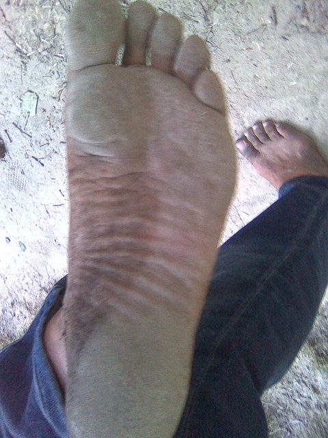 His feet are bare but he obviously does not walk on a beach.