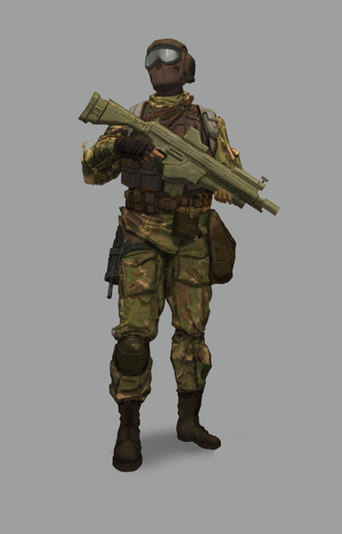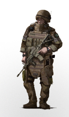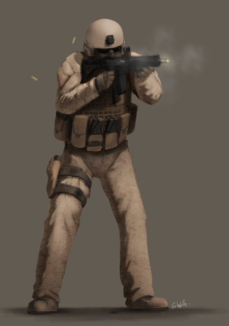 Did you work on this further by any chance? I think the soldier loses depth, especially when his right leg sort of disappears with no background to complement that. Yet he's apparently leaning forward/out a good deal, and that could set up for some good suspense or action.