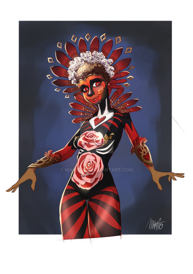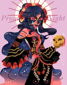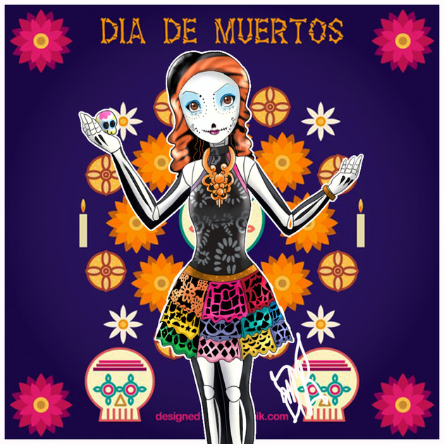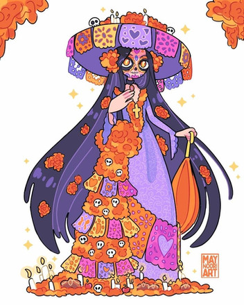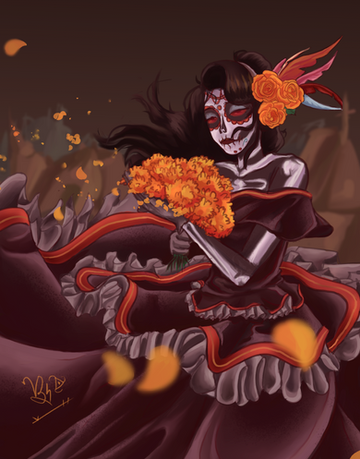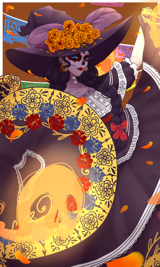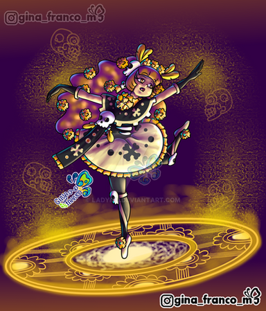 A magical girl based on "el dia de muertos" a Mexican celebraition where people honor the ones that have pased away.Her staff is one of the utensils that is used to make hot chocolate as seen in Mexican tradition, her dress represents the flower of cempasúchil and last but not least she has a traditional headpiece.