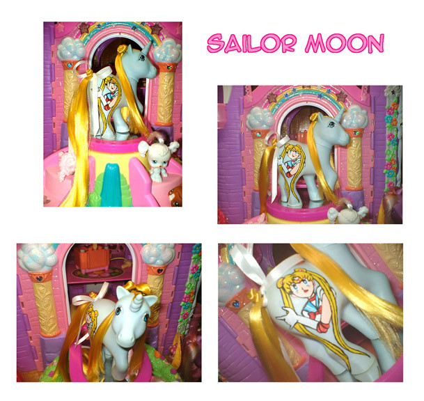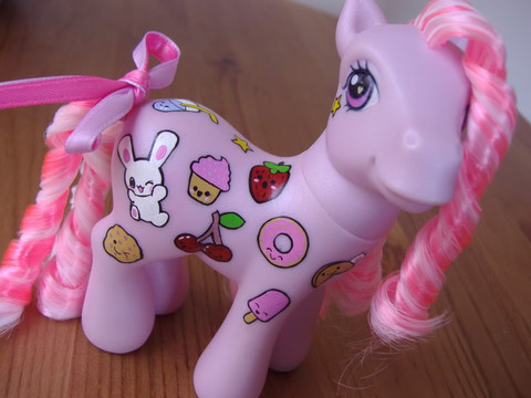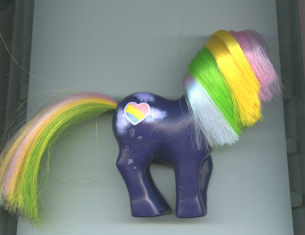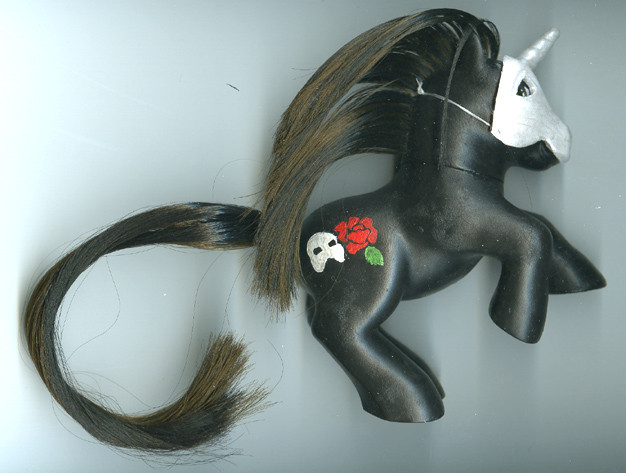 I honestly don't remember who this was before... Golden Delicious, perhaps? She's been rehaired with saran in Black Orchid (which sounds like it should be purple-ish, but is actually a deep chocolate brown). Her symbols was painted freehand.