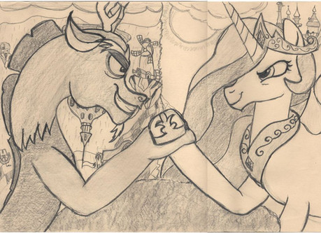 Ok, I know that white pony has several fan-names: Roid Rage, Horse Power, Benchpress, Snowflake, etc. I just went with the most popular one.Discord and this pegasus are some of my favorite characters from MLP:FIM, so I wondered, how they would look if they had a challenge between them? So here they are.
