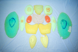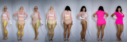 Four pairs of cotton dance tights (extra large), one piece foam hip and butt pads (5cm thick, 67cm tall, 44cm across butt, 28cm across mid thigh), heels, one pair toast shimmery dance tights and one pair glossy tan sheer to waists, both extra large.