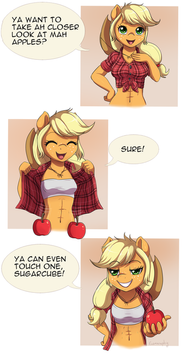 Applejack: *Runs after Blitz* Will you stop chasing my male friends away. They aren't going to touch me.