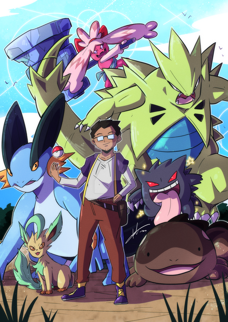 Pokemon trainer and team chilling out beside an old bridge.Related content