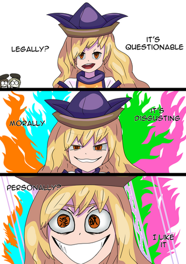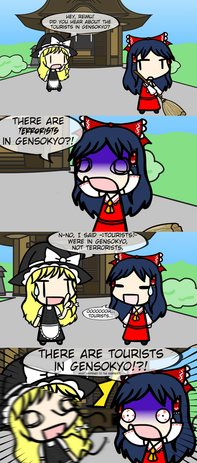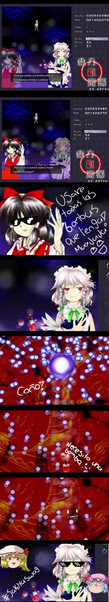 Heres the explanation on whats going on with this parody i have here, If you played Scarlet Weather Rhapsody, you'll be using SPECIAL SPELL CARDS to fight against your opponents, *alternative* Reimu uses extortion papers also...