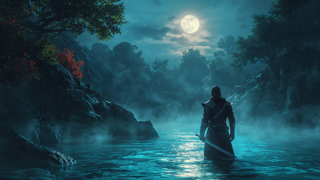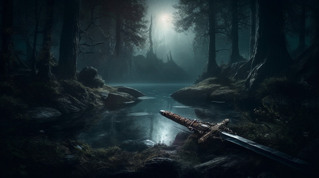 One of two images inspired by the Morte d'ArthurThen Sir Bedivere departed, and went to the sword, and lightly took it up, and went to the water side; and there he bound the girdle about the hilts, and then he threw the sword as far into the water as he might; and there came an arm and an hand above the water and met it, and caught it, and so shook it thrice and brandished, and then vanished away the hand with the sword in the water.