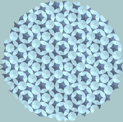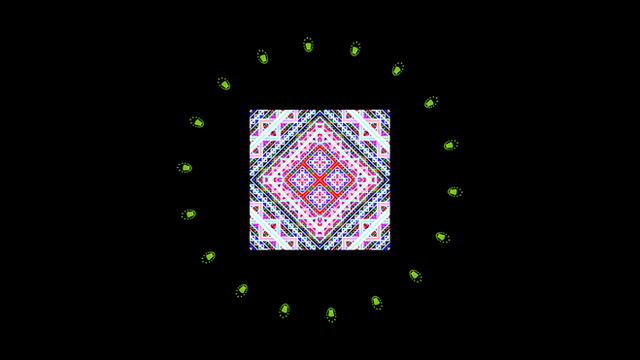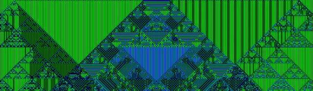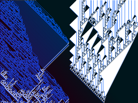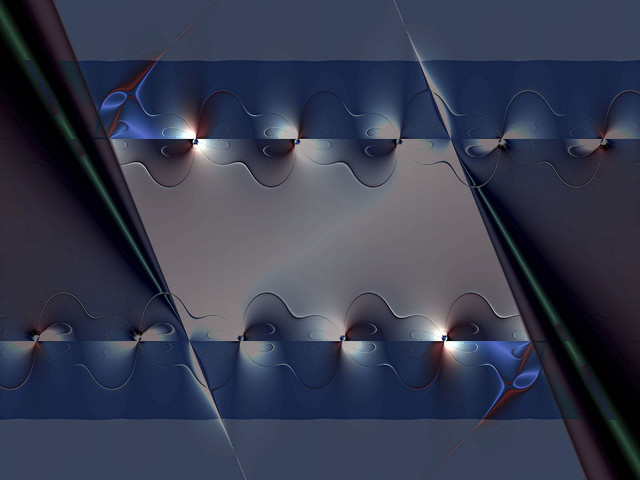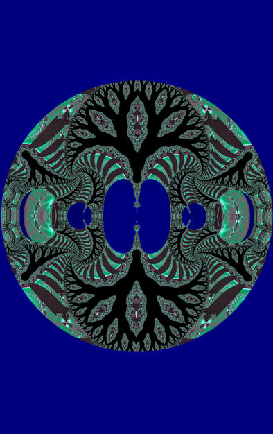 A coloring of a regular square tessellation (tiling) with a motif that includes a recurrent similarity transformation (small copies of the motif are part of the motif). The coloring is vaguely naturalistic, as ocean and atmosphere are suggested by the wave-like spiral elements.The tiling pattern is derived from the largest linear features of a fractal boundary. See [broken link: Thirds waves description] for construction details and templates.