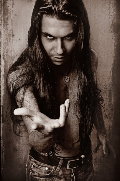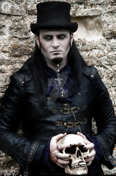 I don't see ANYTHING scary about him, that deep romantic vampiric gaze, that sensuality and darkness enveloped in one...just a normal, every day expression I LOVE seeing. ^_^ And occasionally I give others. I love this shot, this model I think if I didn't know better I'd probably jump his bones -grins- just from that look alone!! The background is amazing, the model is truly convincing and VERY handsome, and if the statuette had eyes, it would look like he was covering them... Interesting. I also love the shading in this, you can barely see his shadow at all, which is also a great effect. AWESOME JOB MARK!!