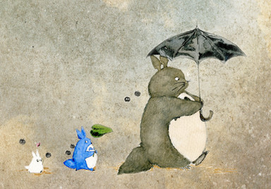 This is beautiful; I love how you bring different aspects of miyazaki's work together. Totoro draws the eye first, then no-face and the little totoros. I especially love how it takes a while to notice the robot as it blends in with the background, which implies trees, while not actually defining them. Above all i like the little kodamas, which you capture perfectly. All in all a very beautiful piece, i would love to be able to buy a print.