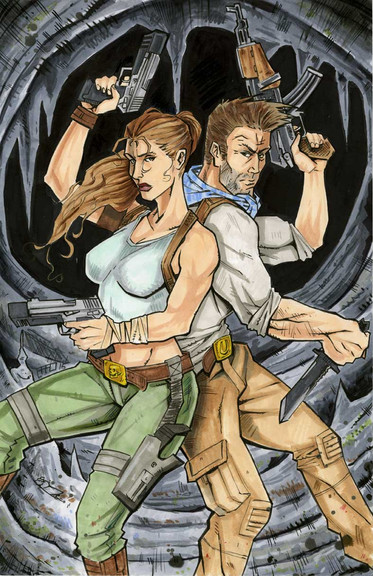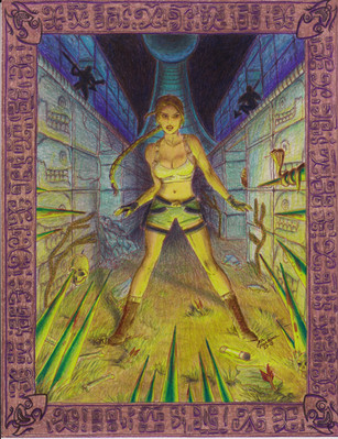 Ink & Watercolor , 11"x17". Hm , why didn't I post this one before? Because I saw so much Tomb Raider art it made me ill. But I still like this one. Never played the game , but I sketched elements by looking over the shoulder of a friend who played it nearly ceaselessy. I have this nicely detailed Maya head keychain , and it seemed perfect to draw Lara kneeling on it. I'd have made bigger boobies , but I was ridiculed out of it. It won't happen again!Mark Moore