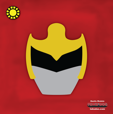 Ken'ichi Akama (赤間健一 Akama Ken'ichi ?) is GoggleRed (ゴーグルレッド Gōguru Reddo ?).GoggleRed wears a red cloth suit with a white torso rounded down towards a stripe around the belt-buckle, with a white belt and a buckle in a triangular form; the long top of the triangle is a stretched-out letter "G" with the Arabic number "5" filling the rest. His gloves are white with a red band around the wrists and the boots are pure white. A pin with the Goggle V logo is pinned on his left side and a scarf flows around his neck. Beneath the belt is a white pocket where he keeps his Goggle Sabre. The helmet is split in three, with a red top and a gray mouthpiece at the bottom. His visor is black with the relief from above the visor falling down making it appear similar to a pair of goggles instead of uniform. Above the visor is an ornate design with a red ruby in the center carved in the shape of a circle, a representation of the number "1".