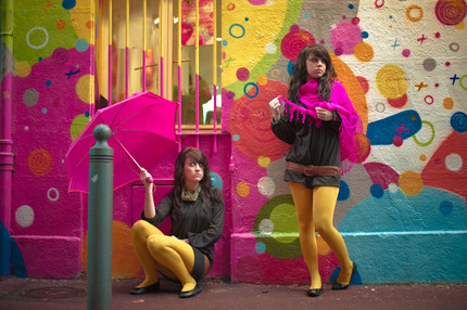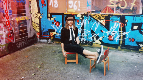 Interesting effect, posing her in front of the painted faces. Is the can on the floor part of the artwork?