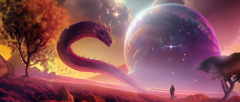 #ai #alien #backdrop #bright #colors #cosmos #depiction #dragon #drake #dreams #dreamy #encounter #fantasy #female #happy #horizon #imagination #lsd #lucid #meetings #peace #peaceful #planet #purple #scifi #surreal #tranquil #woman #worm