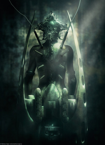 I really like this picture because it is very dark yet light at the same time. Spiders are thought to be dark creatures but this makes it seem to be good, being a guardian. The golden light in the picture is very captivating and the glow it casts on the spider guardian completes its description. It exposes the white armor of the spider which in being white represents it as something protecting. The mouth piece is amazing. I have never seen a picture so captivating in its own style. It is unique in idea and presentation. Very beautiful yet dark.