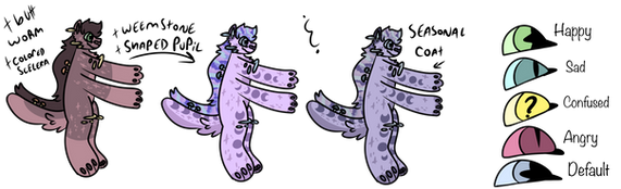 ○ Miscellaneous: Unlimited colors, unlimited markings, tiny back wings, freckles, thumbs, elegant hair, nose swap, glowing eyes, colored scelera, unusual shaped pupils, smooth shaped mouth, forked tongue, spotted tongue, colored tongue, blindness,scar x2, loss limb