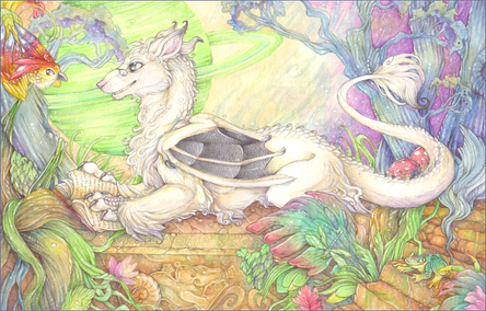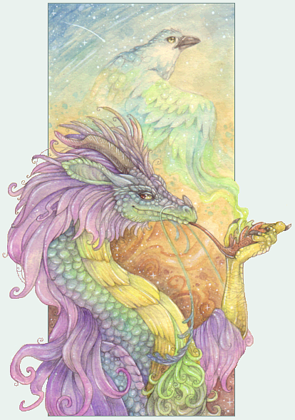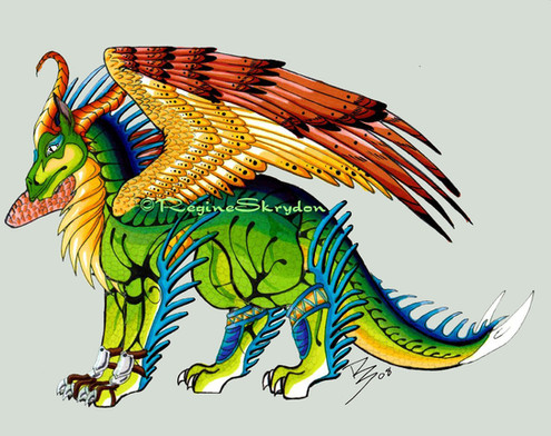 Good colors. The feathers seem almost like scales when they are really small. It is a cool affect. The legs look a little bit akward, especially the missing right hind leg and left front leg. It seem disjointed. The missing hind leg makes the back end look rather small. The wings are also not in a natural angel or possition. Something like that. The beads are an interesting touch, but the one that falls off the wing and behind the tail throws off your sense of distance. It seem to stop in midair.The color transition is great. I love the jewelry and especailly the horns. Excellent face on this one.the background is cool, I am betting that was watercolor. Over all, a rather nice composition